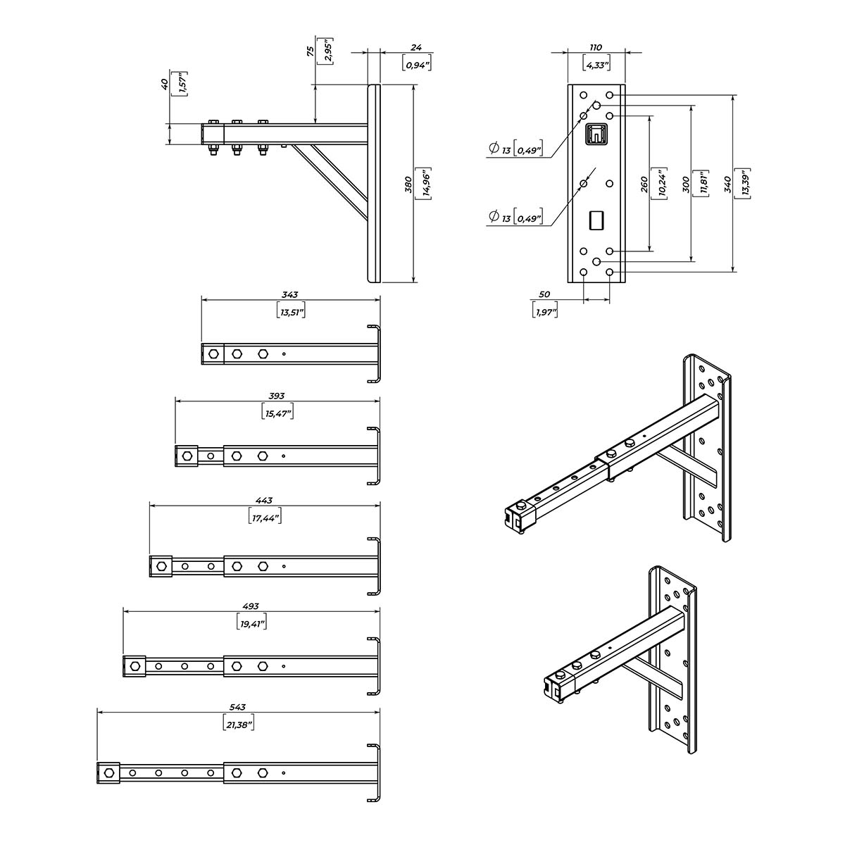 The WBM-500 is a universal wall mounted horizontal distance beam with M10 mounting points for U-brackets etc.